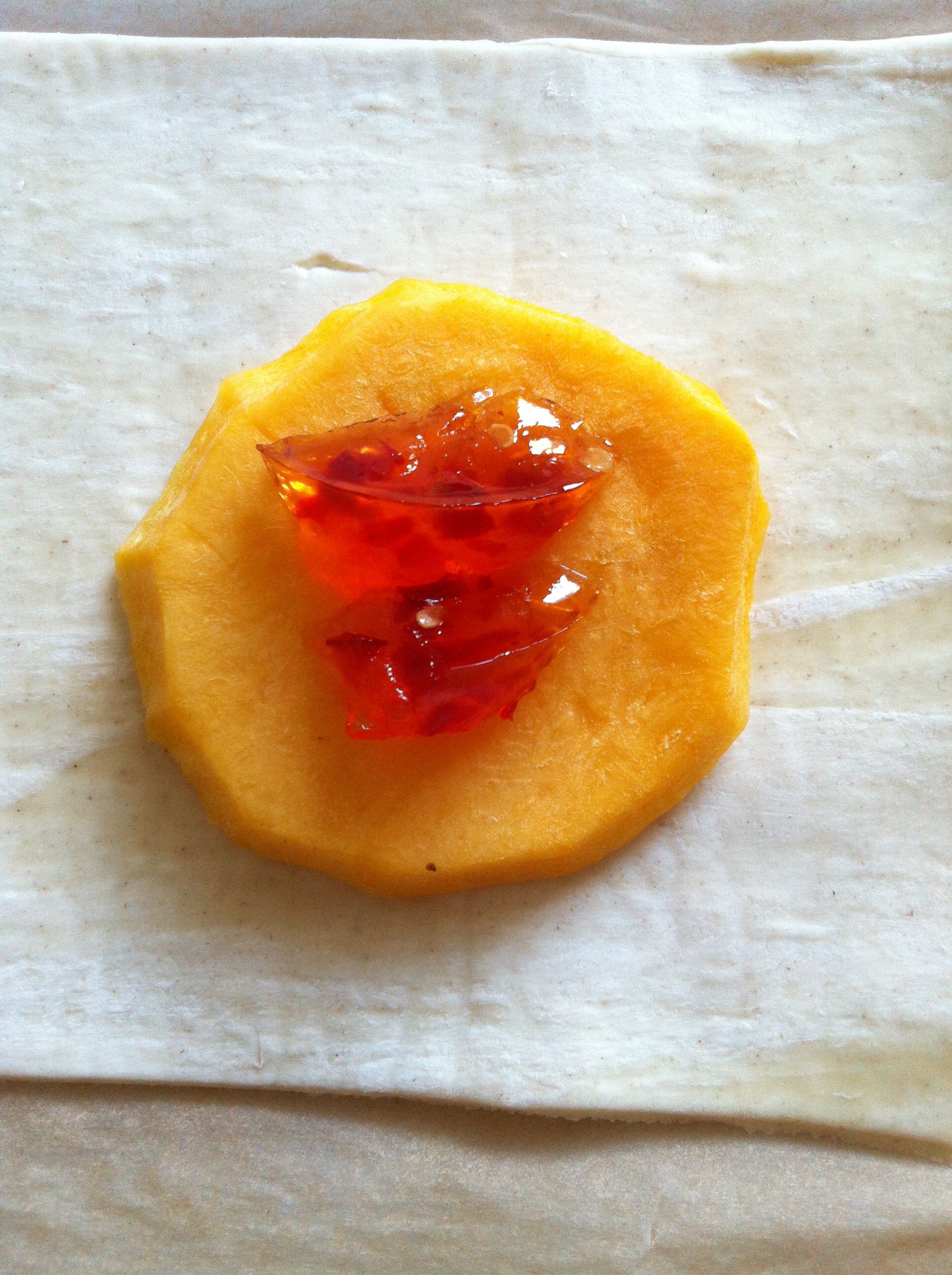 Take the square of pastry, and lay the pumpkin in the middle and top with chilli jam.